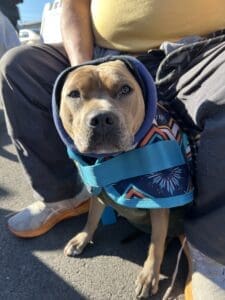 Unfortunately, Michael and Gigi are now back on the streets. On a recent cold night, Michael contacted us because he urgently needed food and a coat for Gigi. A friend let them sleep in a car that night, and the next morning they came to our outreach event, where we provided food and fit Gigi with a warm, waterproof coat.